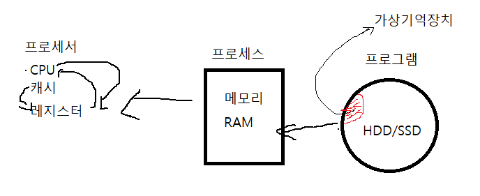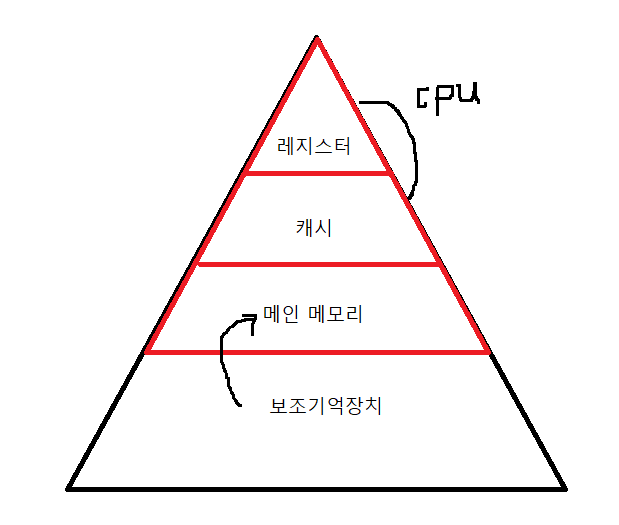 하드디스크(보조기억장치)->메모리(주기억장치)->캐시->레지스터<->CPU